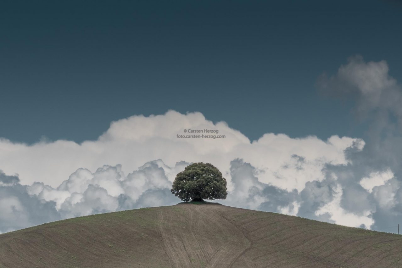 Der Wunschbaum prägt die Spitze einer Erhebung südlich von Siena in der Nähe von Buonconvento.